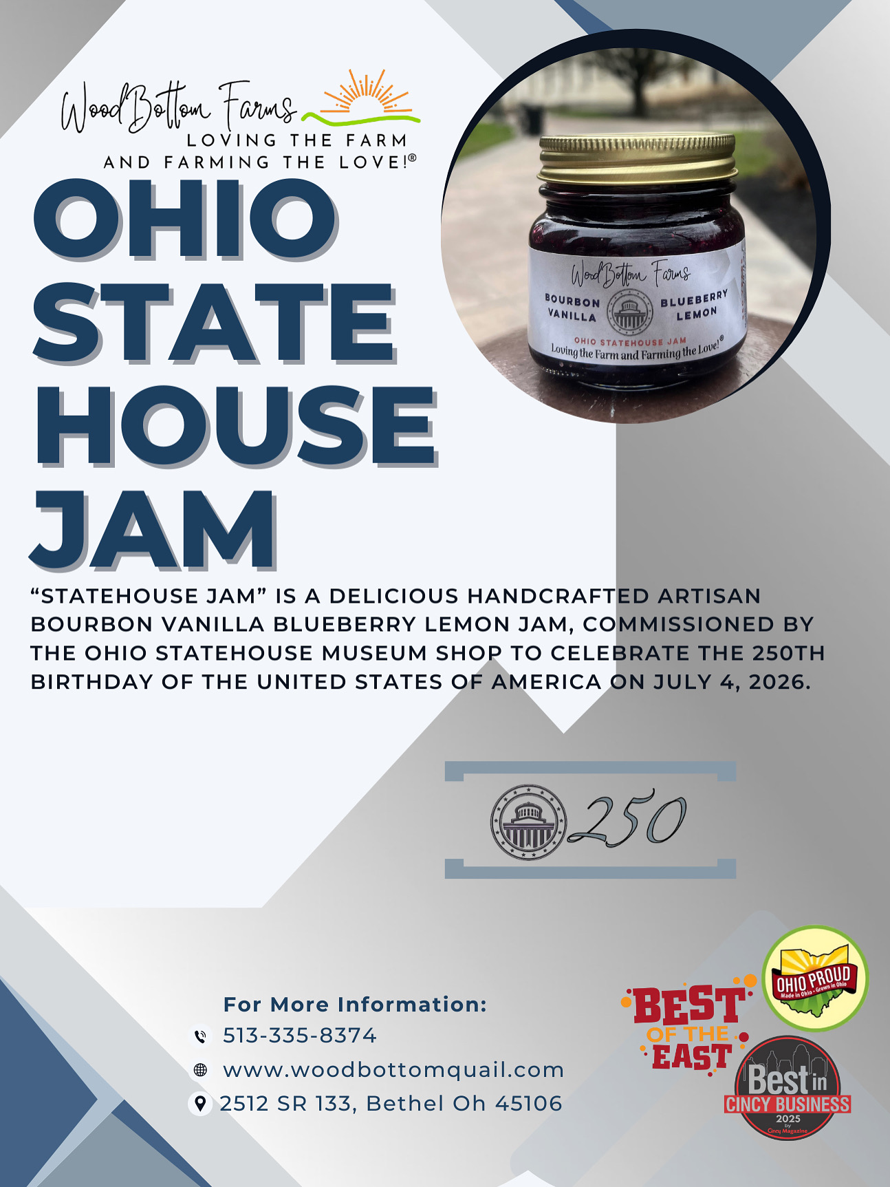 A delicious mix of bourbon, vanilla, blueberries and lemon, Statehouse Jam goes well with just about anything! Try it in meatballs or on pork!! Pour overtop a block of cream cheese, baked brie, yogurt, and ice cream. Add to a sammich or a warm biscuit. Statehouse jam was commissioned directly from the Ohio Statehouse to celebrate the #UnitedStates 250th birthday this coming year.
